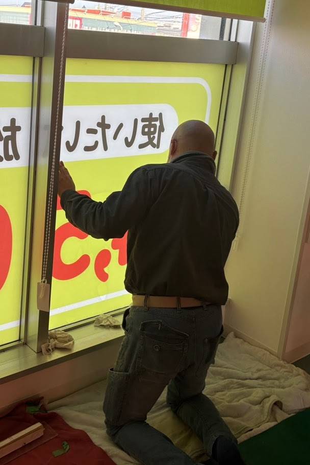 高所ですので店内側からシートを貼らせて頂きました。